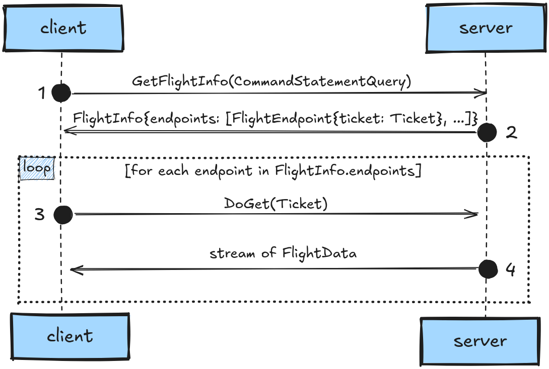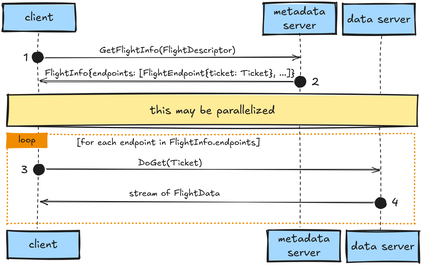 Il modello di interazione è centrato su alcuni concetti chiave. I dataset sono identificati tramite un FlightDescriptor, che può rappresentare sia un percorso (ad esempio un file o una tabella) sia un comando arbitrario (come una query SQL). Il client, tramite chiamate come GetFlightInfo, ottiene una descrizione logica del dataset sotto forma di FlightInfo, che include metadati (schema, dimensione stimata) e soprattutto una lista di endpoint. Ogni endpoint rappresenta una porzione dei dati e contiene le informazioni necessarie (location e ticket) per recuperarli tramite la chiamata DoGet. Questo design abilita naturalmente parallelismo, distribuzione e load balancing, poiché il client può scaricare i diversi endpoint in parallelo, anche da server differenti. Per casi più complessi, Flight supporta anche upload (DoPut) e comunicazioni bidirezionali (DoExchange), rendendo possibile implementare pipeline di elaborazione dati direttamente sul canale RPC.
