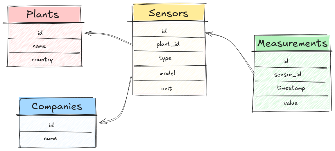 Fig. 1 - Esempio di modello relazionale in ambito energetico. Ogni misura rilevata è associata ad un sensore che, a sua volta, è assegnato ad un impianto e all’azienda che lo ha prodotto.