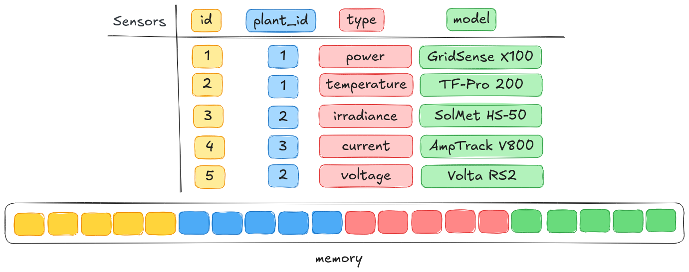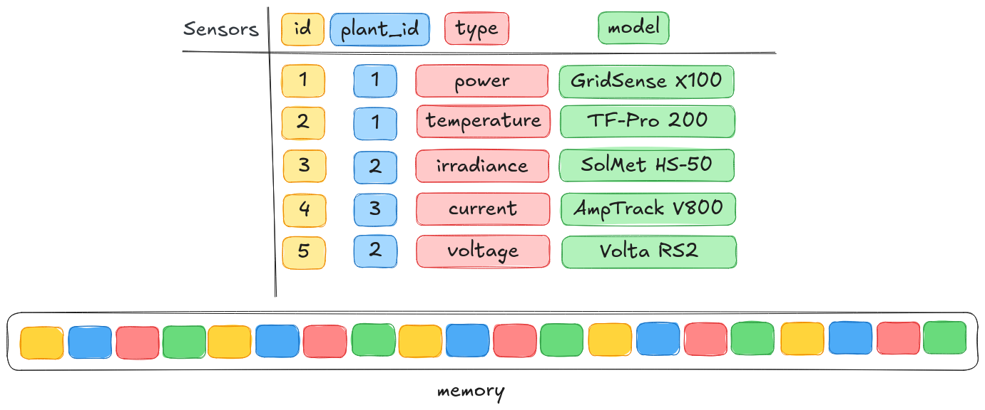 Nei sistemi pionieristici – come il prototipo IBM System R2 – e poi nei database commerciali successivi, questa visione si traduce naturalmente in una memorizzazione fisica basata sulle righe: ogni tupla viene trattata come un’unità autonoma e salvata in blocchi contigui di memoria. Ad esempio, in una tabella “sensori”, tutte le informazioni relative a un singolo sensore (id, impianto su cui è installato, tipo, modello, unità di misura) vengono archiviate una accanto all’altra: leggere o aggiornare quel sensore significa accedere a un’unica porzione compatta di memoria. Una scelta non solo intuitiva, ma anche coerente con il modo in cui le applicazioni interagiscono con i dati, ovvero tramite operazioni su singoli record.