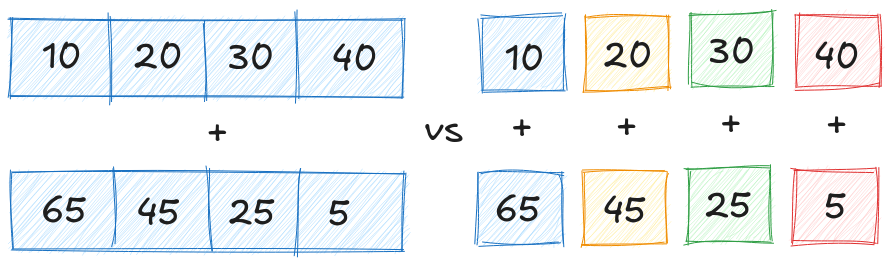 Fig. 3 - I registri speciali utilizzati da SIMD (sinistra) sono in grado di sommare tutti i numeri in una volta sola mentre i registri normali (destra) devono sommarli uno alla volta. I colori diversi indicano momenti diversi in cui avviene l’operazione.