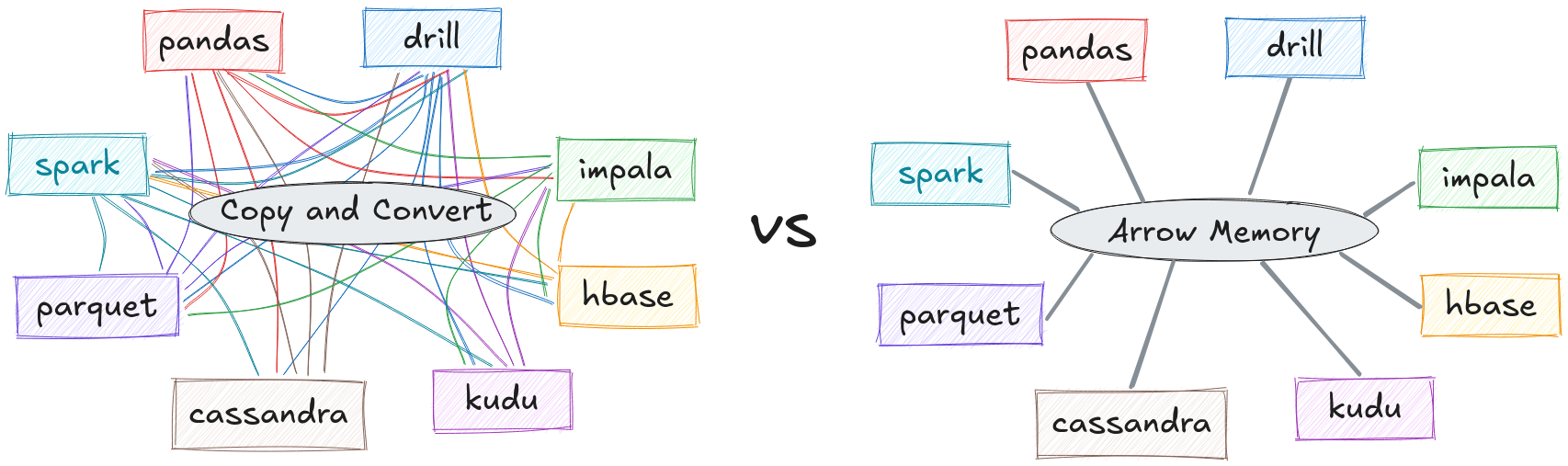 Fig. 5 - Usando il formato Arrow i sistemi possono trasferire i dati evitando costose serializzazioni e deserializzazioni con le associate copie, inoltre la standardizzazione facilita il riutilizzo di algoritmi anche in diversi linguaggi.